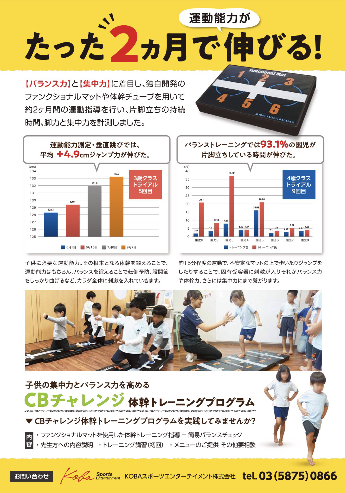 2018.5.10CBチャレンジ!トレーニングプログラム実践しませんか? バランス力と集中力に着目し、独自開発のファンクショナルマットや体幹チューブを用いて約二ヶ月間の運動指導を行い、片脚立ちの持続時間、脚力と集中力を測定! 体幹トレーニングプログラムを実践してみませんか?